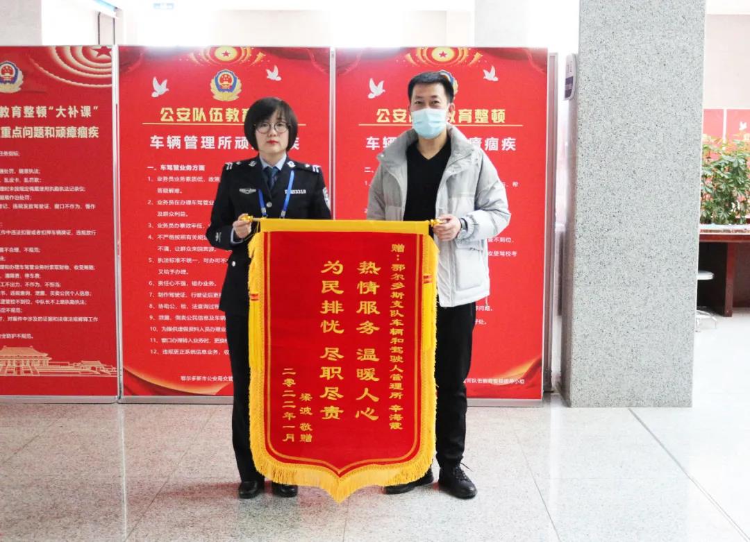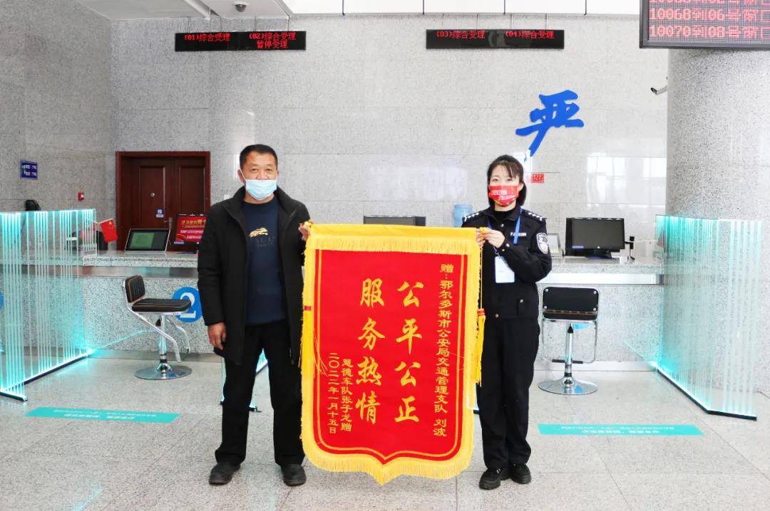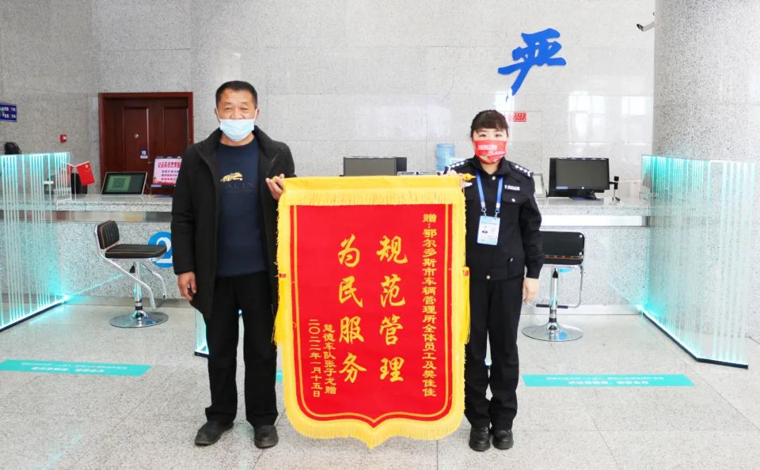 1月17日,慧德车队的一名工作人员来到机动车驾驶人业务管理科将“规范办理,为民服务”“公平公正、服务热情”的锦旗送到业务员樊佳佳、刘波手中,以此表达对工作人员的感谢。